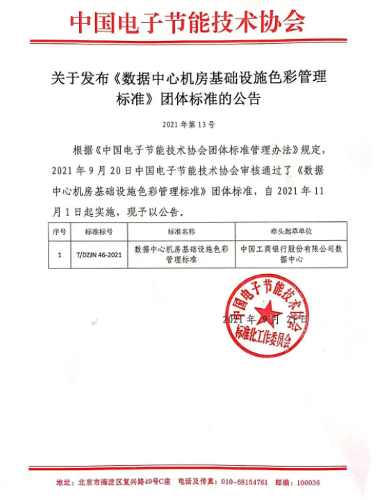 近日,由中国电子技术协会数据中心节能技术委员会、中国工商银行股份有限公司数据中心及其他行业设计院、企业、用户等共同完成的《数据中心机房基础设施色彩管理标准》,经中国电子节能技术协会批准通过,定于2021年11月1日起正式实施,标准编号为 T/DZJN 46-2021。